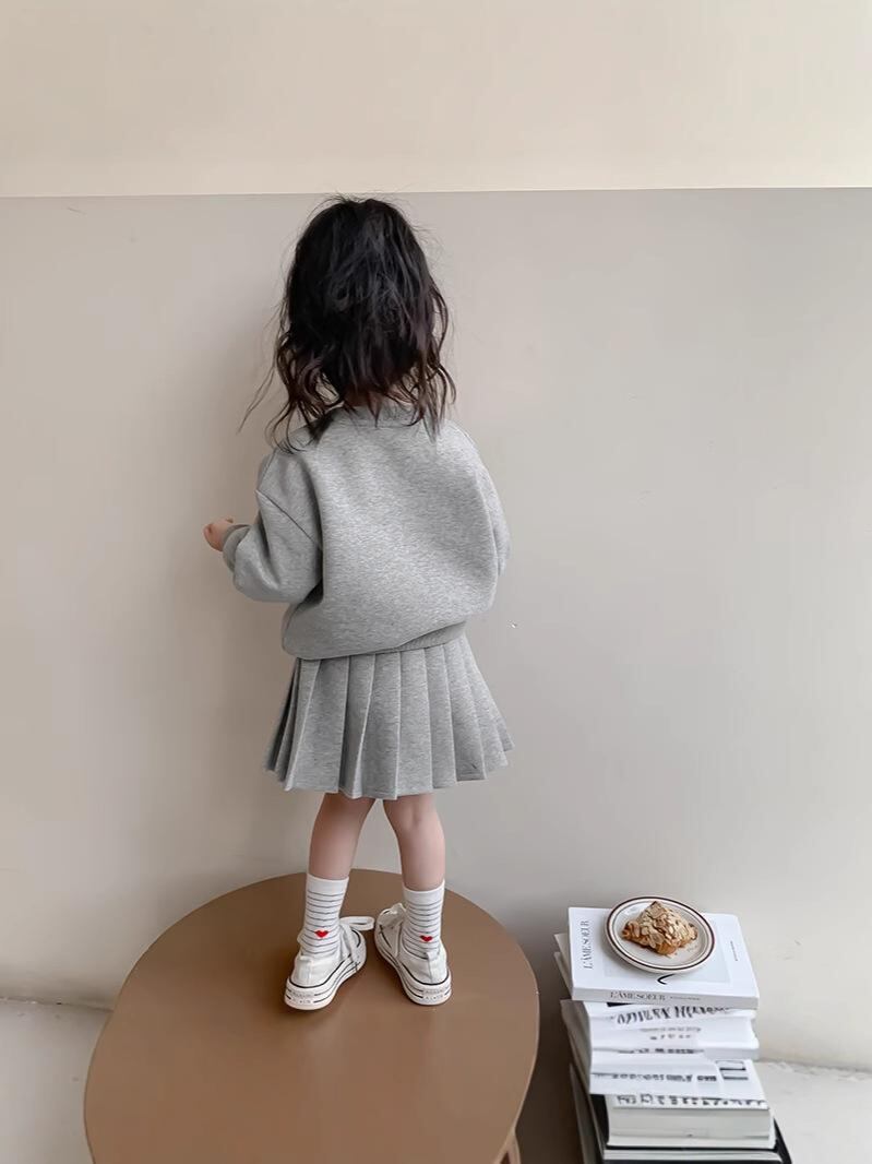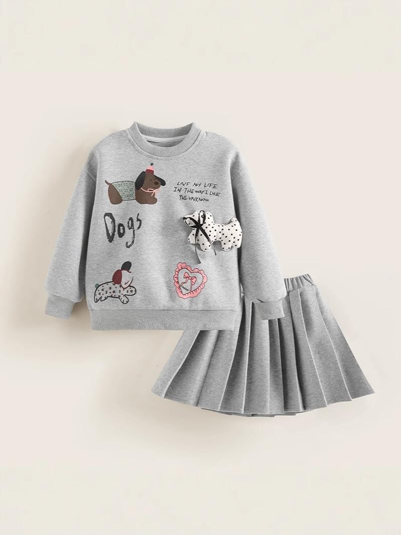 セットアップ スウェット プリーツスカート キッズ 女の子 春秋 長袖 犬 スポーティー 韓国 子供服 グレー